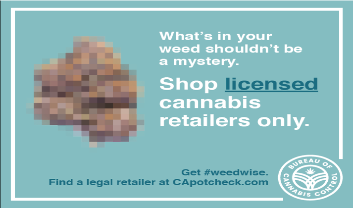 In the meantime, the State of California’s Bureau of Cannabis Control has launched a statewide public information program encouraging consumers to only purchase cannabis from licensed businesses and warning unlicensed businesses to become licensed.