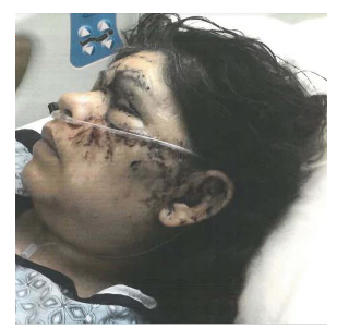 I observed the left side of victim’s face to have what appeared to be several lines of stitching running across her forehead, cheek, eyebrow and eyelid. There was also evidence of either smaller injuries or dried blood in and around left ear lobe.