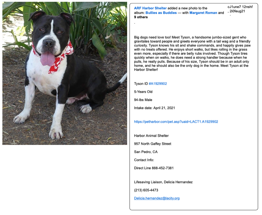 Here is the June 7, 2021, ad for Tyson on the website, ARF Harbor Shelter, adding a new photo to the album, and pleading for adoption of a known dangerous dog, which had already displayed severely aggressive behaviors and reportedly killed another dog. The post is indicated to be by a rescue organization that promotes Pit Bulls and other bully breeds.