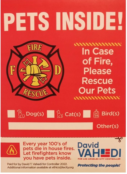When David Vahedi, candidate for L.A. City Controller, recently called me and asked if I would like a “Pets Inside” sticker to notify responders of what creatures at my home would need rescue in a fire or other emergency situation, I realized how remiss I was in not replacing the one that peeled off from heat and old age a few years ago.