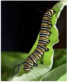A monarch caterpillar feeds on common milkweed, Asclepias Syriaca. Milkweed plants, primarily from the genus Asclepias, are the only food source of monarch caterpillars (USDA).