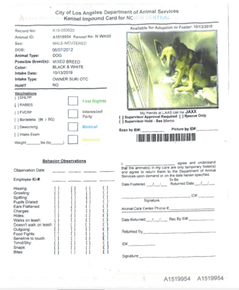 LA Animal Services knew there was a serious problem with this person, “known as Sexy Vegan,” because they admit in their own notes that they had a “do not adopt” order in place regarding him prior to Jaxx being brought to the shelter.