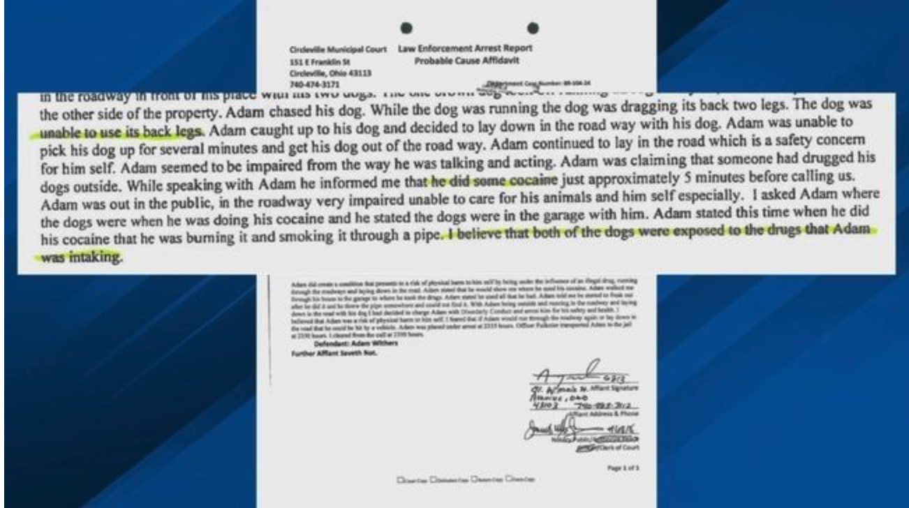 Then two weeks later--September 27---“Ashville Police responded to Kildow Court and reported “they found Adam Withers lying in the roadway with his dogs. His dogs were loose, and he appeared intoxicated, and also admitted to quickly “ingesting all his cocaine prior to their to their arrival.”