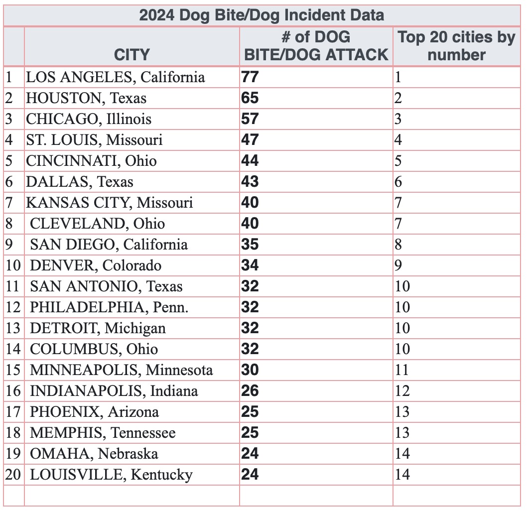 These cities are reported among the top 20 localities with the greatest number of dog bite incidents in 2024 and shows the increase from 2023 (below):