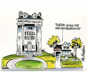 Mansionization eliminates affordable single-family neighborhoods in Los Angeles. The speculators target smaller, affordable houses and replace them with McMansions that are, on average, three times the size and price. They are now eliminating about 2000 such affordable houses per year, and this will continue until it is finally stopped.