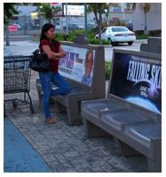 In this time of limbo between the recurring “No” to the shelters and the hope the reappearance of covered bus shelters I came across a startling, and very disturbing sight: Currently, along Santa Monica Boulevard between Sepulveda and Westwood Boulevards are bus benches-street furniture. And on those bus benches are advertisements. There are none of the highly contested advertising pylons along Santa Monica Boulevard. This negates every argument I’ve heard about not placing covered bus shelters along Santa Monica Boulevard.