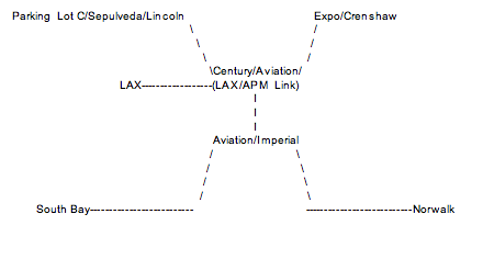 And there is no need for Measure R to pay for a project that would serve LAX's needs instead of that of the Westside and the rest of the county. The Crenshaw/LAX line establishes MetroRail/LAX access from the north, south and east, and the Green Line to LAX should establish MetroRail/LAX access from the Westside to create the final leg of the "X Marks The Spot" configuration Metro and transportation advocates have sought for years, if not decades: