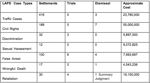 Consider this: The city of Los Angeles has paid approximately 1,000 set-tle-ments and judg-ments to re-solve law-suits against the LAPD from the be-gin-ning of 2002 and ending in Oct. 5, 2011. City officials opt to pay a negotiated settlement consistently, instead of taking their chances at a trial. The perpetual stream of lawsuits filed costs taxpayers millions of dollars each year.