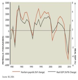 There is a definite correlation between employment and GDP, as you can easily see from the chart above.