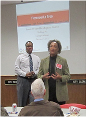 The first meeting was held on Wednesday, December 5 and featured Inglewood Mayor James T. Butts, who spoke to the group. Also attending was former Inglewood Mayor Danny K. Tabor, District 4 council member Ralph L. Franklin and at least one person wearing an orange vest with reflective stripes bearing the Metro logo. Neither Tabor, nor Franklin, nor the person with a Metro vest spoke. The meeting was hosted in part by San Luis Obispo-based RRM Design Group and the key speaker appeared to be the firm's Principal Landscape Architect, Tony Keith.