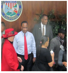 After a few minutes, all attendees were asked to exit via the stairwells on the north side of the building. Inglewood police officers responded several minutes later. LA County Fire Department personnel were said to be on the scene inspecting the allegedly faulty fire alarm box. A tour of the grounds, with video running, revealed no such personnel nor any LAFD vehicles on or near Inglewood city hall.