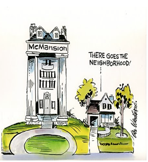 McMansions represent a windfall for contractors and realtors, but their gain comes at the expense of neighborhood character and at a cost to the homeowners living in their shadow. Oversize houses loom high and wide, turning their neighbors’ yards into fishbowls and making their property less desirable.