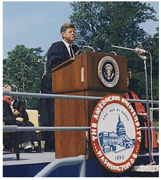 That was President John F. Kennedy speaking to the 1963 graduating class of American University —announcing that the human race was ready to move beyond war. This was the speech in which he revealed that talks on a Nuclear Test-Ban Treaty with the Soviet Union had begun, and that the U.S. was unilaterally suspending atmospheric nuclear testing.