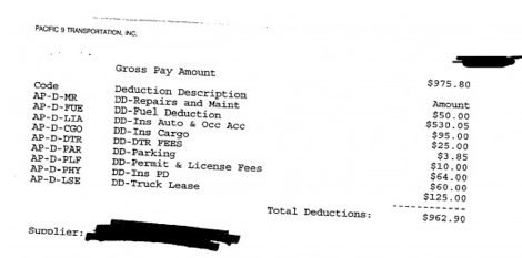 As you can see in the paycheck image above, that is the situation that truck drivers from the port trucking company, Pacific 9 Transportation, are facing. Drivers at Pac 9 move cargo to and from the ports of LA and Long Beach. The trucks they drive are leased from the company at $150 per week ($645 per month). In addition to the lease, the company requires that drivers pay for the maintenance, registration and insurance payments for their trucks. The diesel necessary to move the cargo for the company is also deducted from their paychecks. As we can see, it could amount to $530 per week. The company even charged the drivers with a parking fee to park the trucks on the company premises!