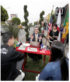 And meeting with local Angelenos in a temporary "pop up office", established in two parking spots in Boyle Heights, is clearly both a crafted media moment and a down-to-earth attempt to connect with ordinary citizens.
