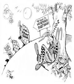 But look out. Here comes the McDonald’s marketing machine with a blur of ads and promotional gimmicks touting “A new global commitment to make a world of difference.” Using endearing pictures of children, the Big Mac chain now claims to be all about fresh veggies, fruit, salads, juices, milk, health, and a fuzzy happiness for all.
