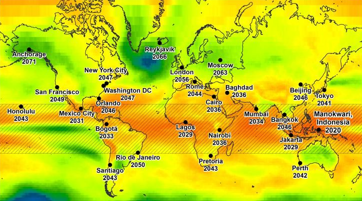 The Mora lab's analysis shows that 1 billion people will find their local climate outside historic norms starting as early as 2020, even if stringent emissions curbs are in place. Without curbs, some 5.5 billion people worldwide will find their homes outside climate norms within 50 years.