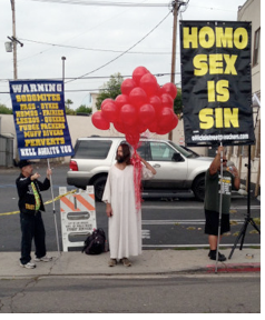 In the midst of the picketing, a man dressed like Jesus in a white tunic and full beard arrived to challenge the protestors. He stood alongside the hatemongers on the sidewalk while carrying a bunch of red balloons. (Read the rest here.)