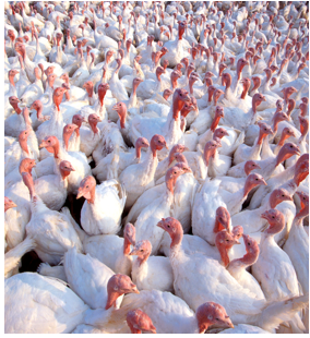 From domestication, turkey breeding continued along a certain trajectory, creating a turkey with maximal breast meat, fast growth, and extreme “feed efficiency” — meaning that the birds gain as much weight as possible per pound of feed they eat.
