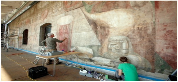 Despite a unanimous recommendation by the panel charged with approving murals for inclusion in the city mural program, the conservative city arts commission refused to fund it, generating a massive fight against its de facto censorship attempt. After considerable community support, the artist completed her mural and it was a source of neighborhood pride. A few years ago, however, the artwork was seriously defaced and its original grandeur has been diminished. Like Conrad’s “Chain Reaction,” repair and restoration should be a matter of urgent municipal priority.