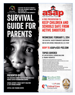 In the year since Sandy Hook, the ASAP committee has done extensive research about the necessary steps in preventing active school shootings. The committee met with law enforcement including LASPD, teachers, school principals, representatives from the LAUSD Board of Education, mental health professionals in the community, as well as from the Los Angeles County Department of Mental Health, and the LAFD Captain (Inspector) for the Schools and Churches Unit.