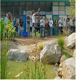 The landscaping is awesome with a man-made river running through the campus. The school has built an outdoor amphitheater where students gather for assemblies or interactive discussion groups.