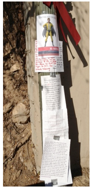 The manifesto drew comments. One neighbor responded, angrily, in an anonymous missive taped below the manifesto. The curb painter offered a rebuttal, plus a cartoon picture of a curb-painting super hero standing astride a red “No Parking” curb with a gray cape and a gray stripe down his front.