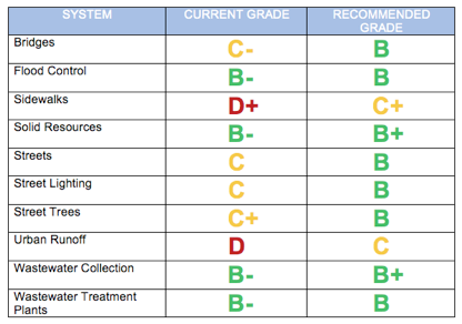 But this 2010/2011 report card only tells part of the story about our failing infrastructure. When compared with a 2003 “Infrastructure Report Card” prepared for then Mayor Hahn the results are devastating. It not only shows that many of these grades have gone down since 2003, but it also reveals that much of the money required to fix our infrastructure was neither secured nor spent at that time. Now in 2014 the amounts needed to repair our infrastructure have almost doubled and the cupboards are bare.