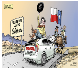 Perhaps more disturbing are the fundamental reasons behind the Toyota move. According to Toyota’s U.S. chief, James Lentz, they weren’t even courted by Texas, which has fattened itself on California’s less-competitive business climate.