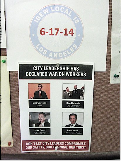 In a flyer, Union Bo$$ d’Arcy has singled out Mayor Eric Garcetti, Controller Ron Galperin, City Attorney Mike Feuer, and DWP Commission President Mel Levine as the culprits who want to “compromise” the safety, training and trust of the DWP employees.