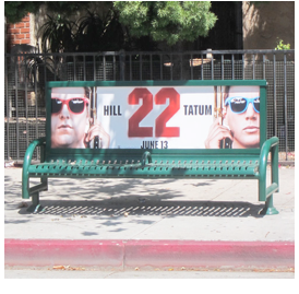 An “R” rating means that no one under the age 17 will be admitted unless accompanied by an adult. In contrast, the bus bench in the photo is directly across the street from a city library on busy Venice Blvd. and kids of any age who frequent that library can gaze upon the actors Jonah Hill and Channing Tatum with pistols raised, presumbably ready to start firing away.