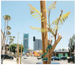 This Jacaranda sapling has been vandalized, but it is one of few that did not have the top completely torn off. Officials have offered a $1,000 reward for information about the crime. (photo by Aaron Blevins)