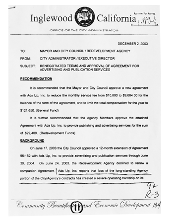 A letter dated December 2, 2003 from then-city manager Mark Weinberg to the mayor (Roosevelt F. Dorn) and city council stated that “It is recommended that the Mayor and City Council approve a new agreement with Ads Up, Inc. to reduce the monthly service fee from $10,800 to $9,664.30 for the balance of the term of the agreement, and to limit the total compensation for the year to $121,650. (General Fund)”