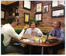 Mayor Eric Garcetti is also playing team ball: “On behalf of the Ratepayers, I urge the Court to appoint a receiver to run these trusts to restore oversight and transparency. This is the Ratepayers’ money, and they have a right to follow their money.” (Photo: Garcetti, Feuer, Galperin strategizing? … at Brents Deli)