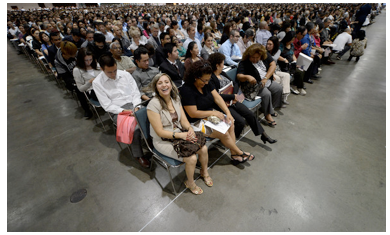 Everything was astonishingly well-organized for the 5,000 future citizens and their 7,000+ guests. Once we entered the grand hall, guests were seated in the back and applicants had to get in lines along a wall where they turned in their green cards (very symbolic) and final questionnaire and then be given new forms—an application to vote (there would be tables out front as well to complete the process), a page on which were printed the Oath of Citizenship that they would take later in the morning and the lyrics to the Pledge of Allegiance and the National Anthem.