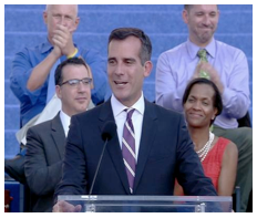 The City Council’s boss Herb Wesson noted that seven of the 15 councilmembers stood by Garcetti on Labor Day – one more would have been an illegal quorum – with the mindless City Attorney Mike Feuer behind him on one side and the soulless Eli Broad on the other.