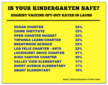 But there is one celebrity-led health trend that has state and LA officials alarmed, and that is the plunging number of children receiving vaccinations against diseases like whooping cough and measles, which has left 25 LA Unified schools, some of them charters, with a vaccination rate that is below the levels recommended by health officials.