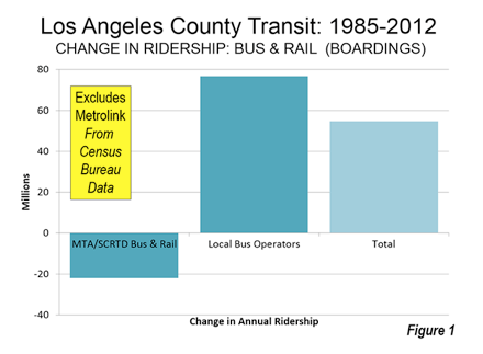 Despite its massive $10 billion rail program. MTA bus and rail services carried fewer riders in 2012 (latest Federal Transit Administration data) than were carried by the buses in 1985 (MTA was formed in the early 1990s from a merger between the Los Angeles County Transportation Commission and the Southern California Rapid Transit District).