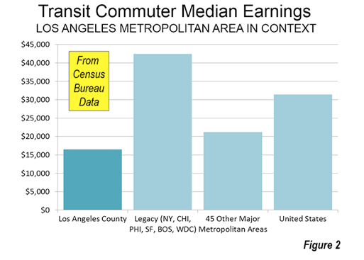 The strong ridership increase in response to the low fare program is consistent with the relatively low incomes of Los Angeles transit commuters. In 2013, the median income of Los Angeles County transit commuters was approximately one-half that of the national, 60 percent below that of the six metropolitan areas with transit legacy cities (New York, Chicago, Philadelphia, San Francisco, Boston and Washington) and even lower than the other 45 metropolitan areas over 1,000,000 population (Figure 1)