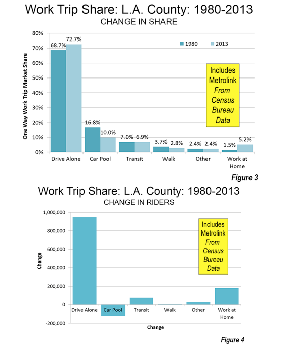 Overall Transit Work Trip Share-Census Bureau data indicates that the employment access share of transit in Los Angeles County has declined modestly, from 7.0 percent in 1980 to 6.9 percent in 2013 (including Metrolink). Driving alone increased from 68.7 percent to 72.7 percent, while car pool commuting dropped from 16.8 percent to 10.0 percent.
