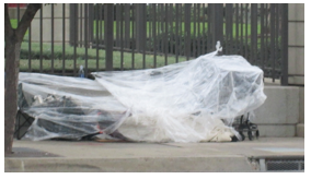 This past Sunday while the Old Veterans Guard protested this tragedy outside the lock front gates to the “National Veterans Home,” a short distance away a homeless Veteran built his own makeshift shelter to protect himself from the cold rain.