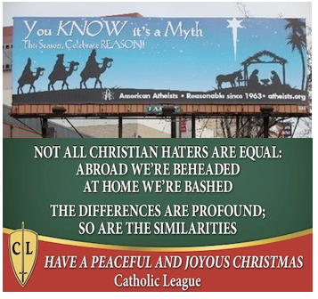 The Catholic League for Religious and Civil Rights, a national organization based in New York, posted a billboard in Mid-City aimed at confronting “anti-Christian sentiment in Hollywood” by comparing it to religious persecution, according to Bill Donohue, the organization’s president. The billboard reads: “Not all Christian haters are equal: Abroad we’re beheaded, at home we’re bashed. The differences are profound; so are the similarities. Have a peaceful and joyous Christmas.”