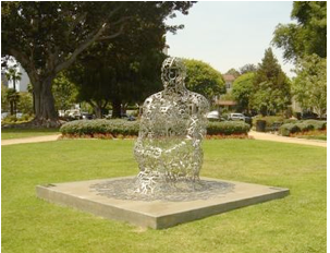 In the Beverly Garden Park, located on S. Santa Monica Blvd and Beverly Drive, there are 8 amazing pieces in one block definitely worth a visit. Among these art pieces is an exceptional treasure. It is the sculpture entitled, Untitled (part of the Endless V series), by world-famous Catalan Spanish artist Jaume Plensa installed in 2012. As you can see from the picture, it is a stainless steel sculpture of a seated human made up of a lattice of letters and characters of eight different languages: English, Hebrew, Arabic, Chinese, Greek, Spanish, etc… similar to the demographics of Beverly Hills. My interpretation: Mankind is made up of many different cultures and languages, yet we are made with the same material reminding ourselves to love, understand and appreciate each other.