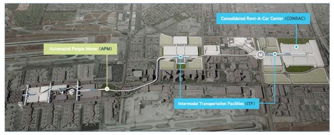 The concept of a Consolidated Rent-A-Car Center (CONRAC) with a freeway connection, and both a Metro station at 96th/Aviation and an Intermodal Transportation Facility to accommodate commuters from cars, buses and trains to/from LAX, all tied together via an Automated People Mover (APM) to connect to the Central Terminal Area, is one that is the result of years of exhaustive and collaborative efforts between the City of LA, LA World Airports and Metro.