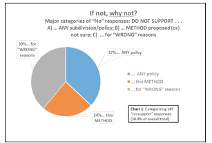 As shown in Chart #1, the brief survey offered the complete text of the proposed policy without any further explanation. In addition to lacking any background – and with no option to say “don’t know,” two additional factors play into the ability to categorize the responses, skewing further many ”no support” and “why not” responses.