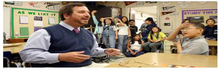 Every year his students produce and perform a Shakespeare play. His students love him. Their parents love him. Teachers from around the country visit Room 56 to see him and his kids in action.