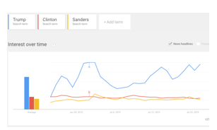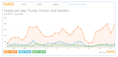 Trump is far from a simple media-manufactured spectacle. Just look at these charts from GoogleTrends and social analytics service Topsy, which measure popularity in the form of message volume on the two platforms.