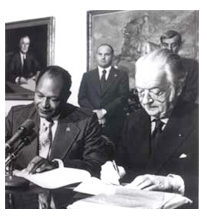 (Left: photo of Mayor Bradley and Lord Killanin signing contract at the White House.)