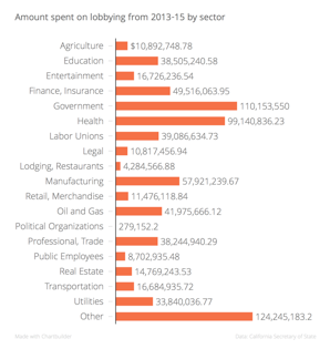 The money spent on lobbying by government agencies — cities, counties, school districts, water agencies, even rent control boards across the Golden State — consistently ranks at or near the top of the heap. Recent state filings show the government sector spent $22.3 million on lobbying and influence efforts in the first six months of 2015, on top of the $87.8 million spent in the previous two year legislative session.