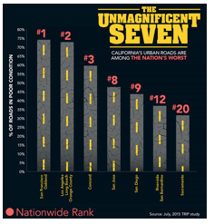 One-quarter of local streets and roads will be in “failed” condition by 2022 under current funding levels. The estimated annual cost of deficient and congested roads, and traffic accidents in California is $44 billion – nearly $2,500 per motorist annually, the commission says. Furthermore, more than one-fourth of California’s bridges are in need of repair, improvement or replacement, 11 percent of the state’s bridges are structurally deficient, and 17 percent are functionally obsolete.